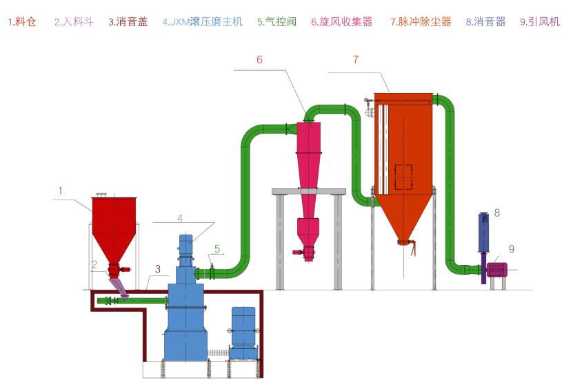 JXM環(huán)輥微粉磨(中速微粉磨)全套設備包括:錘式破碎機、斗式提升機、儲料倉、電磁振動給料機、主機、選粉機、擴散式雙旋風集粉器、脈沖式除塵器、高壓風機、消聲器。主機電動機通過減速機帶動主軸及各層轉盤旋轉,轉盤通過柱銷帶動幾十個環(huán)輥在磨環(huán)滾道內滾動并旋轉。大塊物料經破碎機破碎成小顆粒后由提升機送入儲料倉,電磁振動給料機將物料均勻的送到上轉盤的中部,物料在離心力的作用下散向圓周邊,并落入磨環(huán)的滾道內被環(huán)輥沖壓、滾碾、研磨而粉碎,物料經第 一層粉碎后又落入第二層及第三層,高壓離心風機的抽吸作用將外部空氣吸入機內,并將經過第三層粉碎后的粗粉帶入選粉機內。選粉機內旋轉的渦輪所產生的渦流使粗顆粒物料回落重磨,細粉則隨氣流進入旋風集粉器并由其下部的卸料閥排出即為成品,而帶有少量細粉塵的氣流則經過脈沖除塵器凈化后通過風機及消聲器排出。